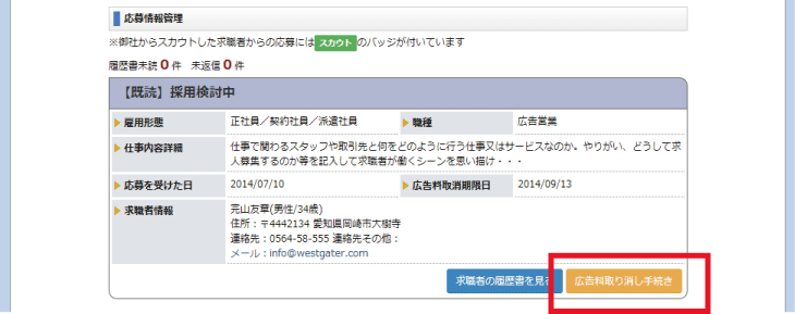 御社専用ページが表示されますので 「求職者の応募管理/広告料取消」ボタンを押してください 。