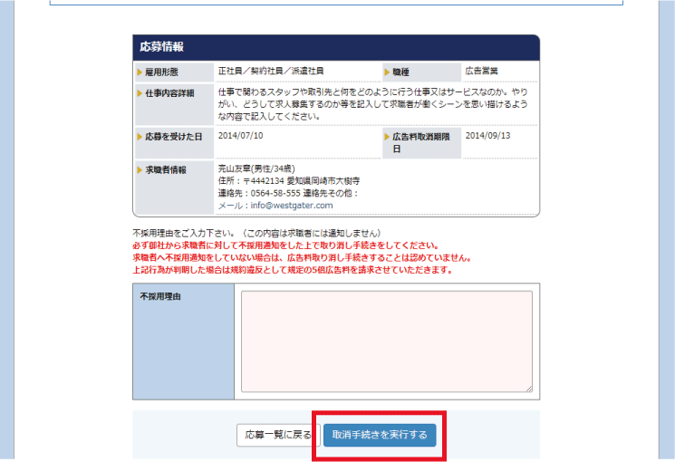 広告料取り消し手続をする求職者の 「広告料取り消し手続き」ボタンを押してください。